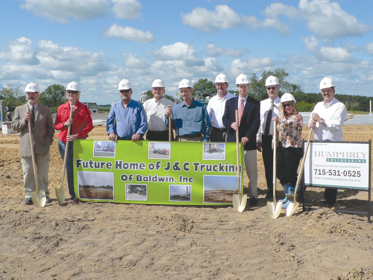 Community leaders, village officials, and the general contractor joined Cindy and J.R. Haley (second and third from the left) for a ceremonial groundbreaking to mark the start of construction on the J&C Trucking of Baldwin, Inc. facility in the Baldwin I-94 Business Park.
